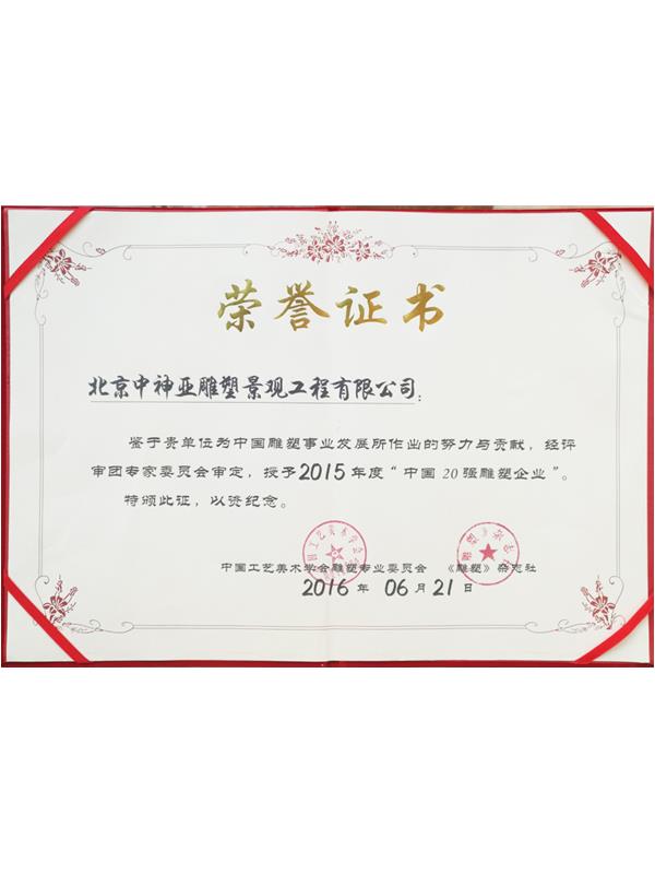 • 2015年度中國20強雕塑企業榮譽證書