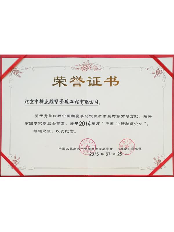 • 2014年度中國20強雕塑企業榮譽證書